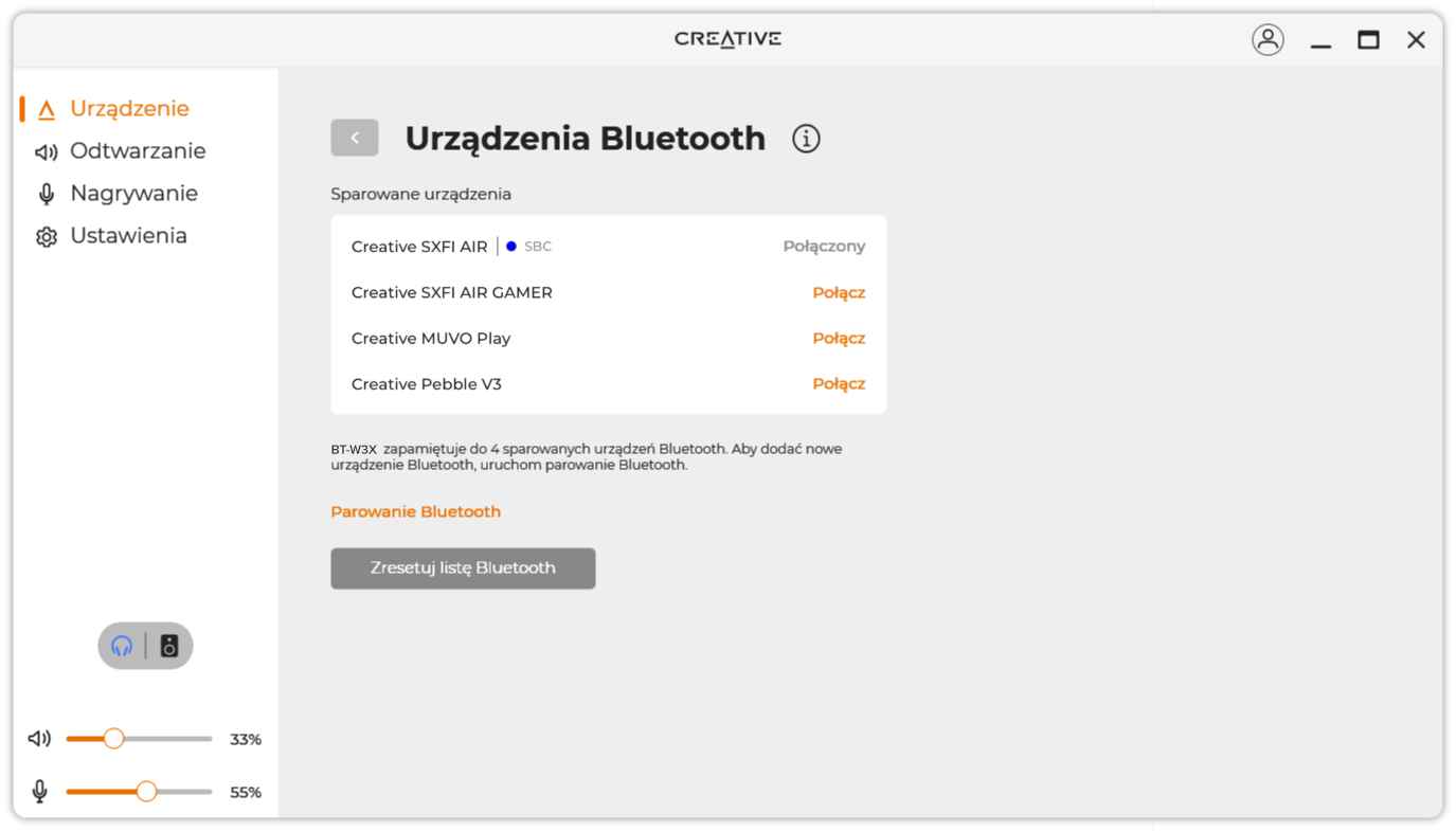 Nie pamiętasz kolejności parowania urządzeń? Bez obaw. Pobierz aplikację Creative i zainstaluj ją na komputerze, aby sprawdzić zapamiętane urządzenia. W aplikacji możesz też łatwo wybrać pobliskie urządzenia do sparowania lub od nowa stworzyć całą listę podłączonych urządzeń.